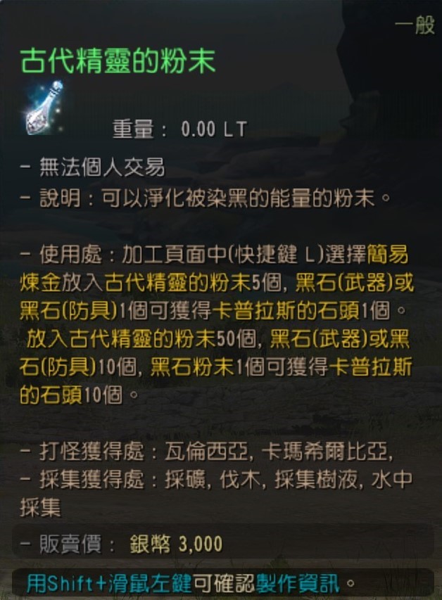 3.古代精靈的粉末可大量加工,使用50個古代精靈的粉末與10個黑石(武器/防具)與1個黑石粉末通過簡易煉金加工可獲得10個卡普拉斯的石頭。(但與加工一個石頭時煉金經驗值相同)