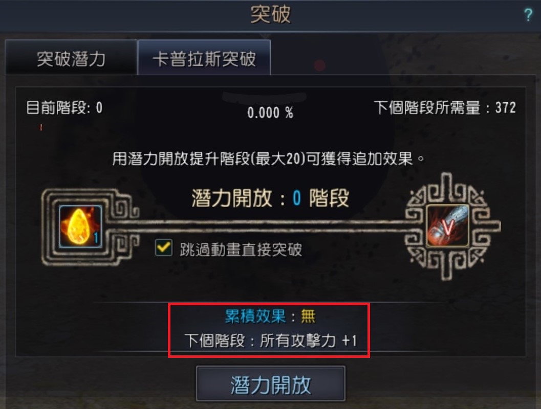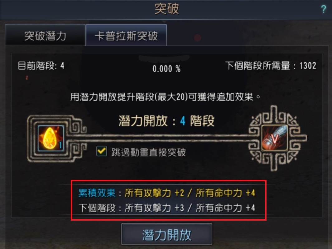 潛力開放是隨著等級而可獲得額外能力值,潛力開放的等級越高,就可以看到漸漸變強的裝備。